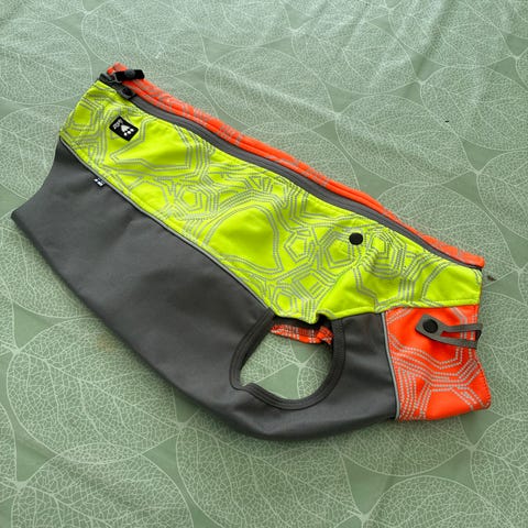 Refleks hundedækken i gul farve. Dækkenet har reflekterende detalje langs kanten for øget synlighed i mørke. Det lukkes med rem i siden og er velegnet til brug på gåture og udendørs aktiviteter, hvor hunden skal være let at se.