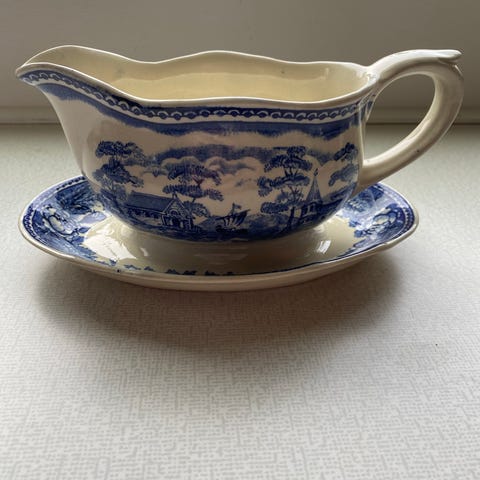 Gråt mønster landskab Arabia sovsekande med tilhørende underfad i porcelæn. Klassisk, oval form med hank og hældetud. Dekoreret med trykt motiv langs kanten og ydersiden. Egnet til servering af sauce eller sovs ved borddækning. Underbunden er stemplet med Arabia-mærke.produceret 1932-49