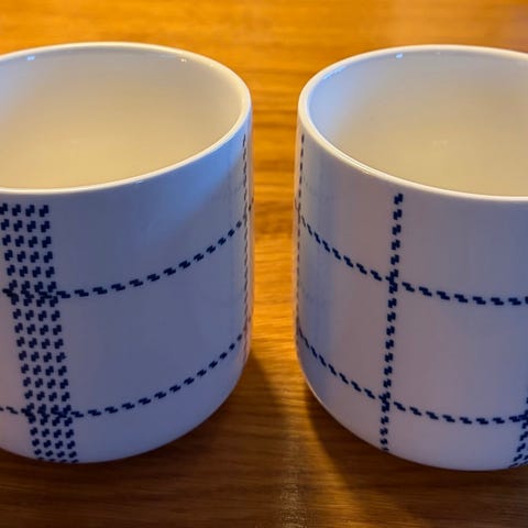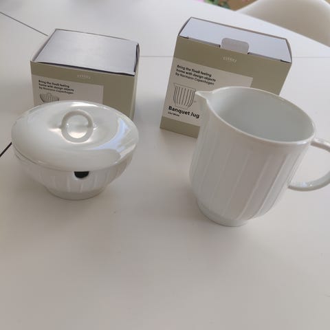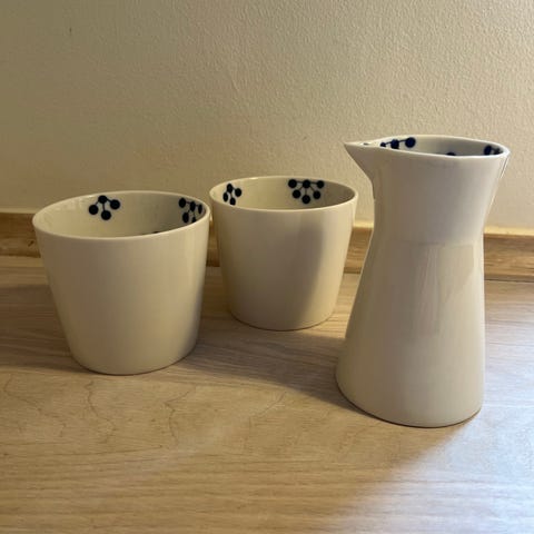 Normann Copenhagen kop og mælkekande i porcelæn med hvid bundfarve og blåt ternet mønster. Sættet består af en lille kande med hældetud, velegnet til fx mælk eller fløde og matchende kop uden hank. Egnet til servering af varme eller kolde drikke og til brug i køkken og på bordet. Man kan sagtens bruge også til små krydderurter og buketter og skål til snacks 🍓