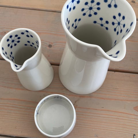 Normann Copenhagen kopper og mælkekande porcelæn hvid med blåt ternet mønster