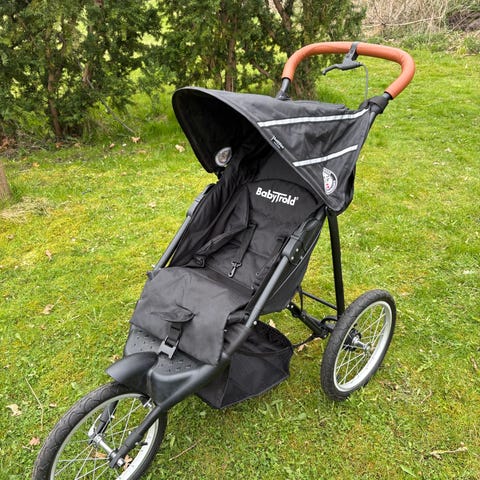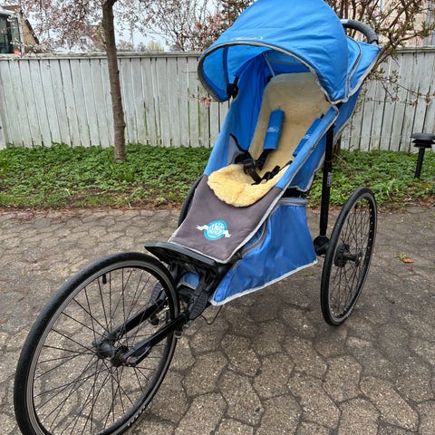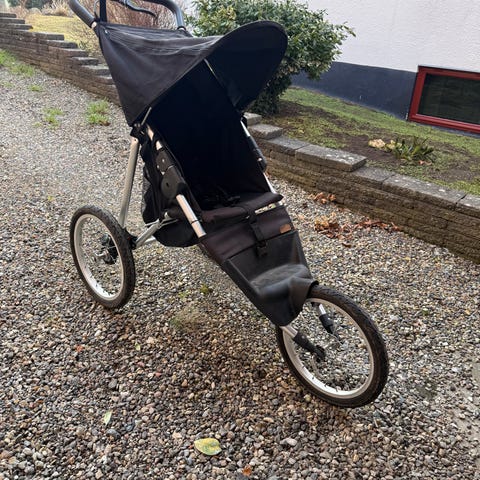 Fin løbevogn med seler og lille rum til opbevaring under. Med soltag. Bremser mv fungerer som det skal.