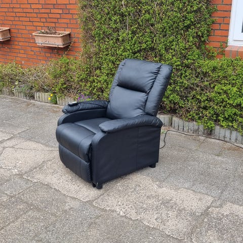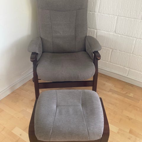 Med hvile- og katapult funktion. Gråbrun kunstlæder. Stolen har transporthjul, som kan deaktiveres, så stolen står stabilt. Der er et par steder med slitage - se billeder.