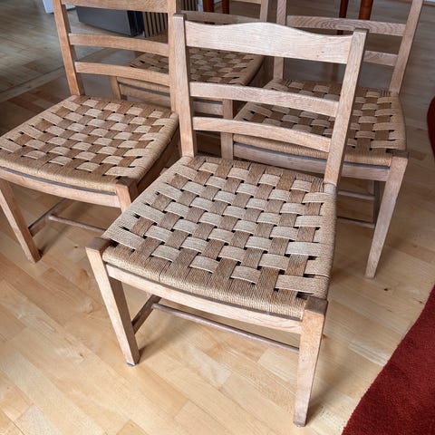 To stole af birk i skandinavisk stil med sæde af flettet, vokset papirsreb. Fin stand men Flettet på den ene med brud men kan stadig bruges (kan nyflettes for ca 800)
