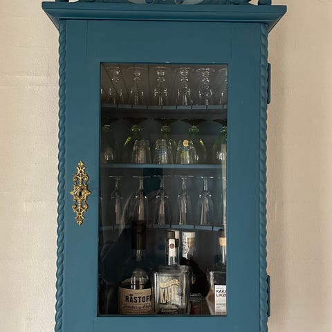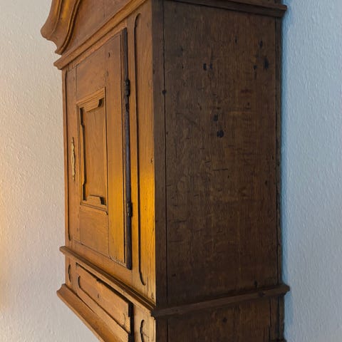 Vægskab i træ med én låge og en indvendig hylde. Skabet har en skuffe nederst samt profileret top og udskårne detaljer på lågen.