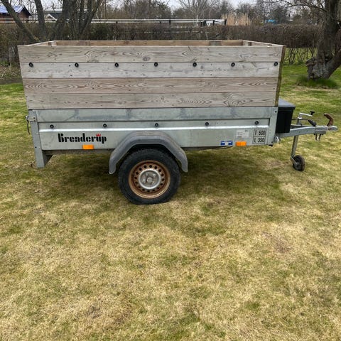 Variant Brenderup trailer i galvaniseret stål. En-akslet åben ladtrailer med stålsider og træbund. Udstyret med baglygter, reflekser og fast trækkrog. Egnet til transport af haveaffald, byggematerialer og andet gods i hverdagsbrug. Fin trailer den bliver leveret nysynet med plader og registreret