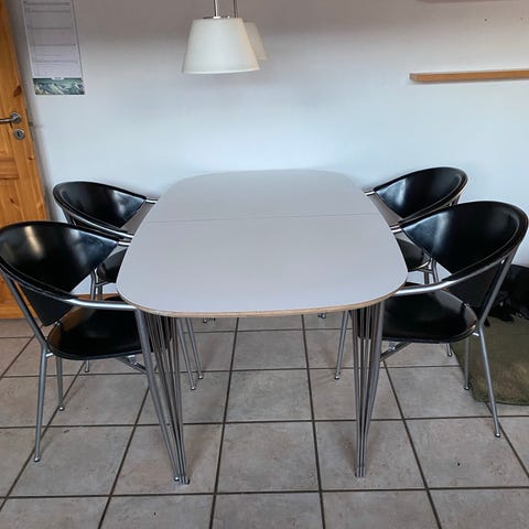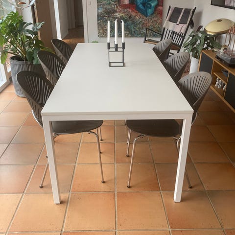 Sælger dette utroligt praktiske og stilrene spisebord. Bordet har en slidstærk hvid laminatbordplade med sort kant og matchende sorte ben, hvilket giver et moderne og grafisk look, der spiller perfekt sammen med f.eks. Eames eller andre skalstole.