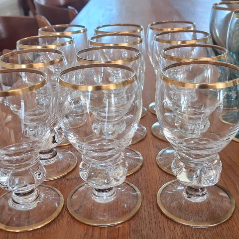Holmegaard glas gisselfeldt med guldkant. Sættet består af glas i både klart og grønt glas, alle med guldfarvet kant foroven og på foden.