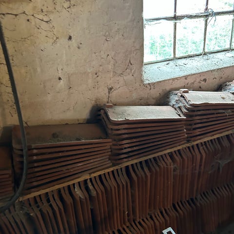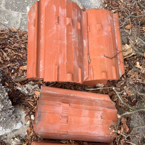 Tagsten i tegl i rød farve. Stenene ligger stablet på paller og i bundter. Velegnet til tagdækning, reparation eller udskiftning af eksisterende tegltag. Antal, mål og profiltype bør kontrolleres ved afhentning, da dette ikke fremgår præcist af billederne.
