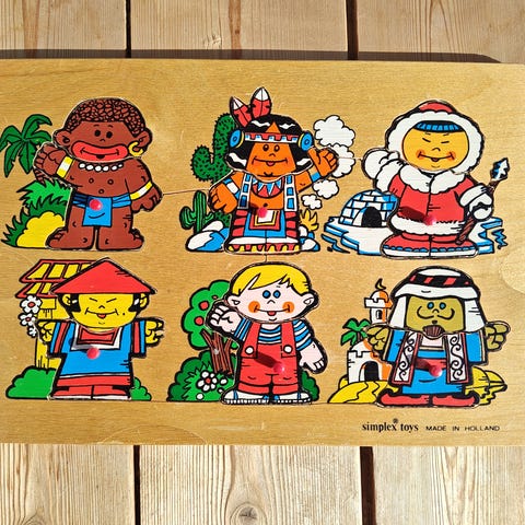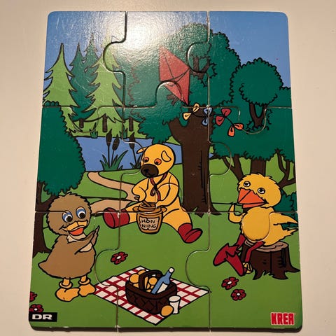 DR Maki træpuslespil med knopper med motiv af ællinger i skoven. Puslespillet består af en træplade og flere brikker med små knopper, der gør det lettere for barnet at gribe og placere brikkerne. Motivet viser ællinger på picnic og leg i naturen. Velegnet som enkelt og overskueligt puslespil til mindre børn, der øver finmotorik og hånd-øje-koordination.