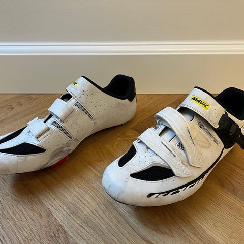Force Road cykelsko i størrelse 41. Skoene er i sort med gule detaljer og har tre velcrolukninger over vristen.