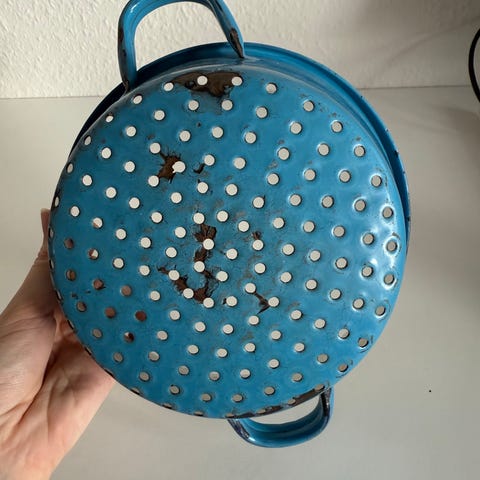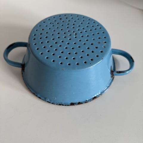 Dørslag i blå og hvid emalje. Dørslaget har to håndtag og perforeringer i bunden.