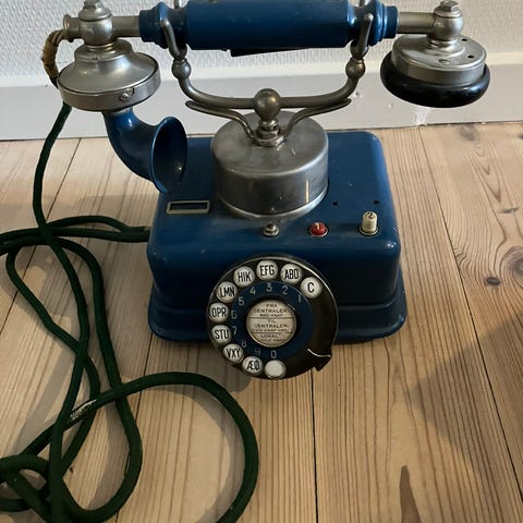 bordtelefon med drejeskive i orange farve. Telefonen har klassisk roterende nummerskive med bogstaver og tal, metalskål til klokke og håndsæt i matchende orange med metaldele. Ledning mellem håndsæt og base samt ekstra sort ledning er synlig på billederne. Velegnet som fastnettelefon, rekvisit eller indretningsobjekt, afhængigt af tilslutningsmuligheder og funktionalitet.