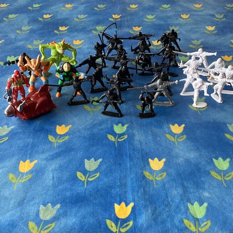 Blandet parti små plastikfigurer bestående af forskellige riddere, soldater og fantasifigurer. Figurerne er i forskellige farver og størrelser og forestiller både middelalderriddere, moderne soldater, robotlignende figurer og andre actionfigurer. Egnet til leg, samling eller som tilbehør til dioramaer og rollespilsscener.