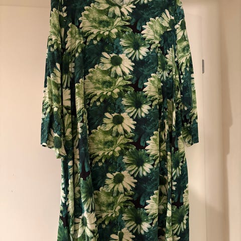 Masai hverdagskjole til kvinder i størrelse M. Kjolen er fremstillet i viskose og har et multifarvet mønster med overvejende grønne nuancer. Modellen har lange ærmer og rund halsudskæring. Velegnet som hverdagskjole.