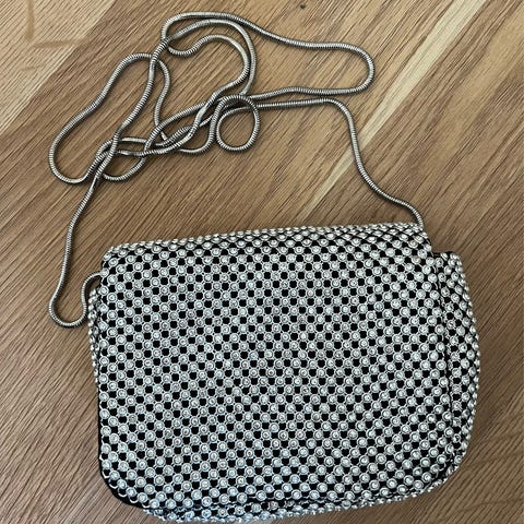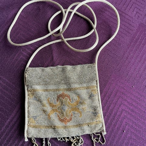Perletaske skuldertaske. Tasken har lang skulderrem af samme perler som selve tasken og en klaplukning med perleknap.