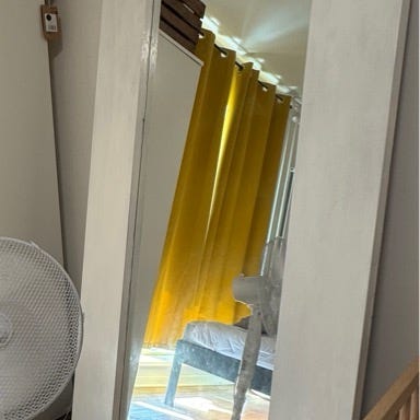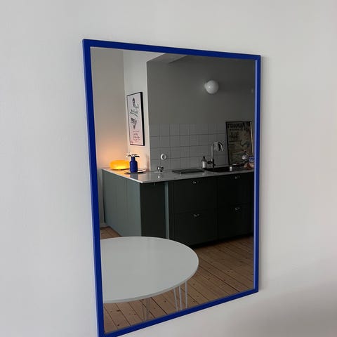 Fedt spejl købt hos lokal håndværk/designer værksteds butik i København. Det er et tungt gulvspejl med blå kanter.