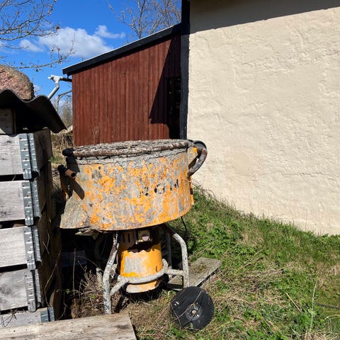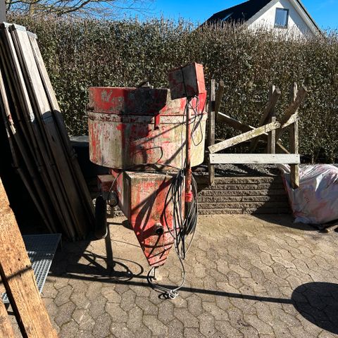 tvangsblander i grøn farve. Blander med fastmonteret gitterlåg og understel med ben og hjulskinne. Velegnet til blanding af mørtel, beton eller lignende byggematerialer på byggeplads eller værksted. Strømtilslutning og øvrige tekniske specifikationer fremgår af typeskiltet på maskinen, hvor model og kapacitet kan aflæses ved besigtigelse.