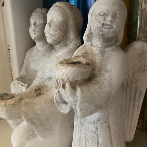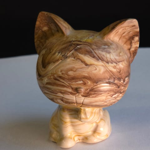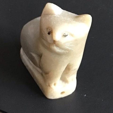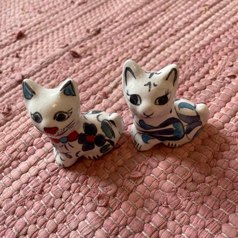 Sæt med to små kattefigurer i sten. Figurerne er udskåret i en lysegul sten med naturlige farvevariationer, herunder områder med rosa og brunlige nuancer. Kattene er formet i en enkel, stiliseret siddende positur med markeret hoved og krop. Velegnet som pyntegenstande, samlerobjekter eller til brug i små dekorationer. Størrelsen fremgår af billederne og er små nok til at stå i vindueskarm, på hylde eller skrivebord.
