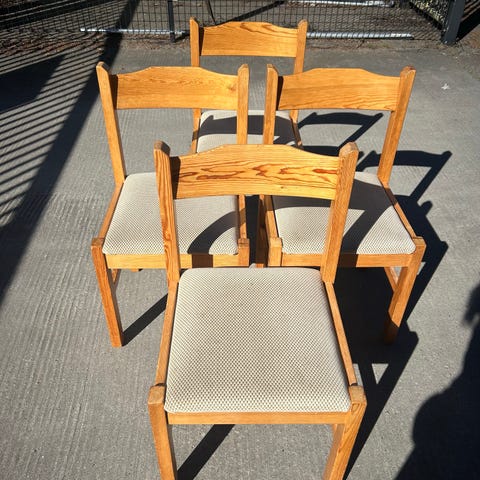 Fire solide stole i massivt træ. Lakken er begyndt at patinere naturligt, hvilket giver dem et råt og autentisk vintage look. De står stabilt og fejler intet rent konstruktionsmæssigt.