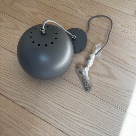 Frandsen Ball pendel i grå farve (18cm). Klassisk kugleformet loftlampe egnet til belysning over bord, i stue, køkken eller gang. Pendlen giver nedadrettet lys og kan bruges enkeltvis eller flere sammen for mere lys. Leveres i original emballage som vist på billedet. Sælges samlet.