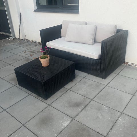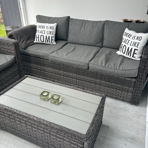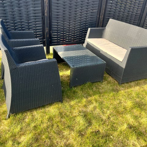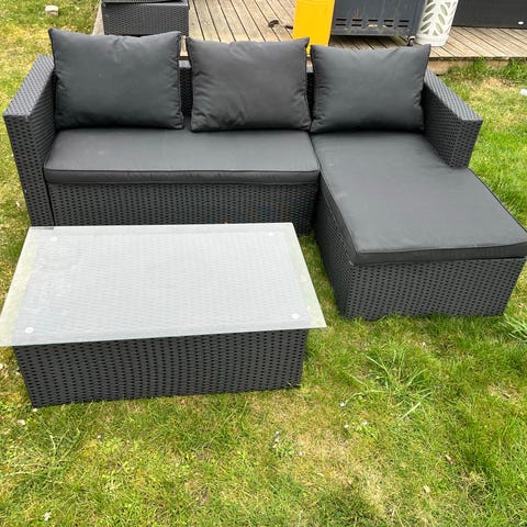 Havemøbelsæt loungesæt i polyrattan med grå hynder. Sættet består af en 2-personers sofa, to enkeltlænestole og et rektangulært sofabord med glasplade. Rammerne er udført i mørk polyrattan, og hynderne er tykke og polstrede i grå tekstil. Velegnet til terrasse, altan eller have som siddegruppe til afslapning og samvær udendørs.