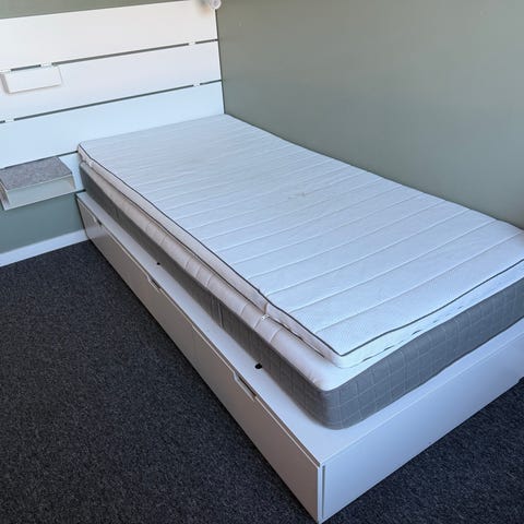 Brugt som gæsteseng med få brugsspor. Madrasser som nye, få brugsspor på maling pga. flytning