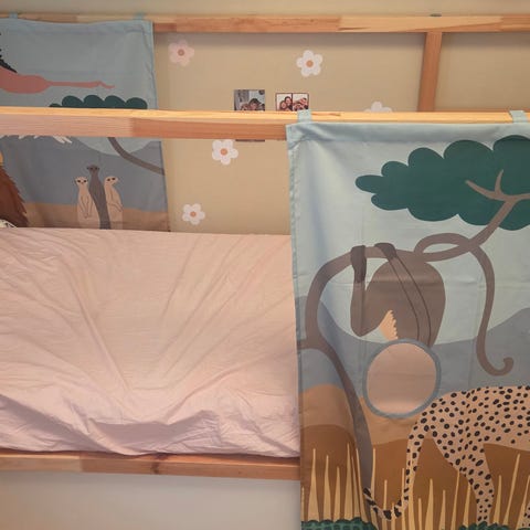 IKEA højseng til børn i træ med integreret stige og sengehest på langsiderne. Sengen har lamelbund i træ og er egnet til standard børnemadras i enkeltsengsstørrelse (ikke inkluderet). Konstruktionen giver plads under sengen, som kan anvendes til opbevaring eller legeområde. Velegnet til børneværelse, hvor der ønskes ekstra gulvplads under sengen.