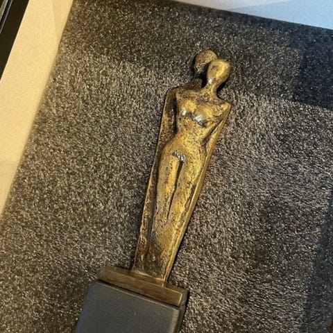 Skulptur i bronze forestillende en knælende menneskefigur, der skubber mod en rektangulær blok.