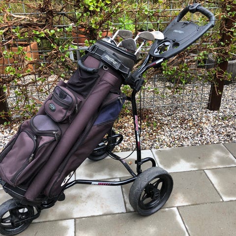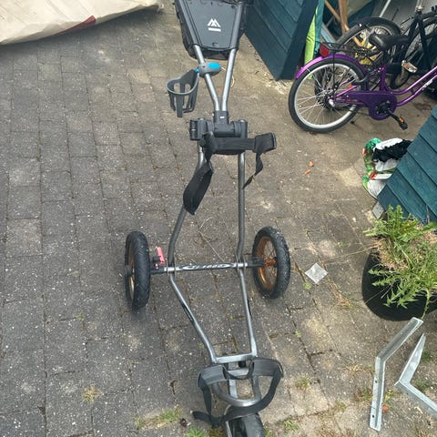 Sammenklappelig golf trolley i metal med to hjul. Velegnet til transport af golfbag på golfbanen. Trolleyen kan foldes sammen for nem opbevaring og transport i bil eller skur. Justerbart håndtag på den lille, og holder til golfbag sikrer stabilitet under kørsel på banen.