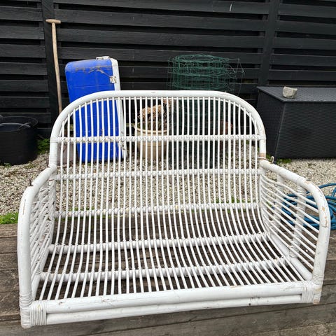 Bambussofa med naturfarvet hynde. Alle lameller er intakte og den fremstår i fin stand. Målene er ca. 130 cm lang, 66 sm bred og 78 cm høj i ryggen. Den er perfekt til altanen eller den lille terrasse. Bemærk at hynden har lidt pletter og skjolder men betræk kan tages af og vaskes eller farves. Obs. Puderne følger ikke med.