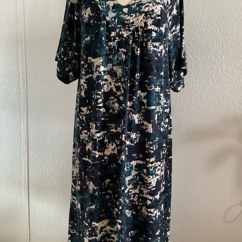 Virkelig smuk kjole med et multifarvet mønster i blå, grønne og lyse nuancer. Den har v-udskæring, korte ærmer og knaplukning foran. Modellen er knælang til midi-længde afhængigt af højde og har let taljering for en løs og behagelig pasform. Velegnet til både hverdag og fest.
