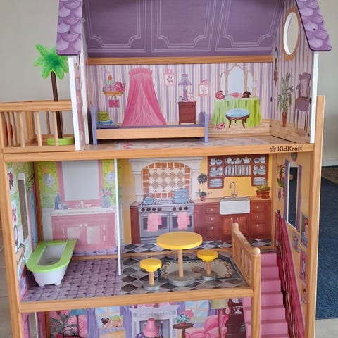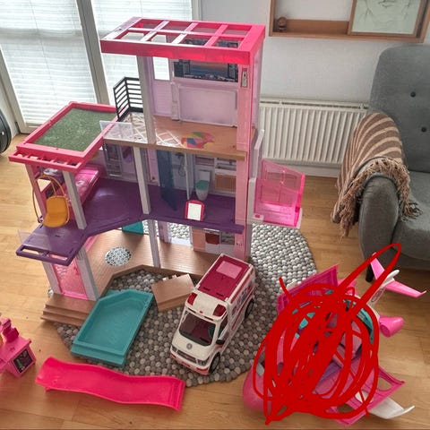 Barbie dukkehus med flere etager, indrettet med forskellige rum og tilhørende møbler og tilbehør. Huset indeholder blandt andet seng, sofa, stole, klaver, badekar og andre små møbler samt dukker og køretøjer som biler og scooter. Egnet til leg med Barbie-dukker og lignende modedukker i standardstørrelse.