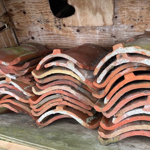 75 røde tagsten i tegl fra Højslev. 42 cm lange. Klassiske bølgeformede tagsten velegnede til skrå tage på bolig. Byd.