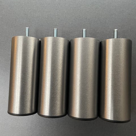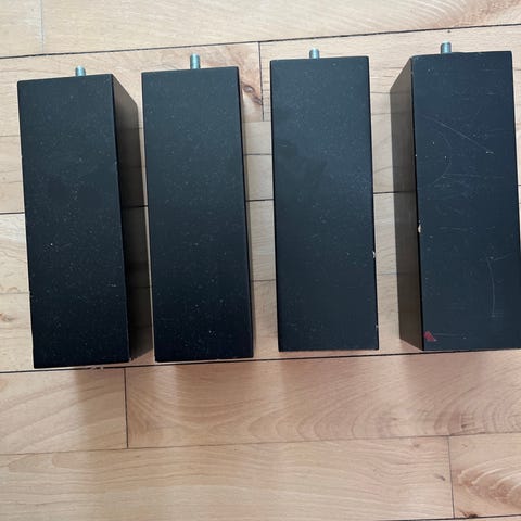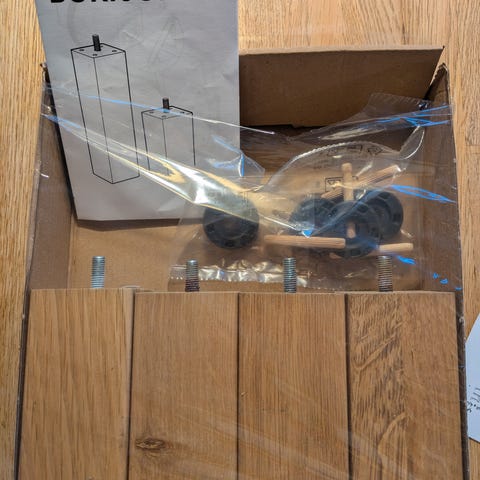 IKEA sengeben i sort. Sættet består af fire ben med gevind til montering på seng eller sengeramme. Benene er fremstillet i mørk massiv træ med drejet form og leveres med tilhørende plastskiver til montering. Velegnet som udskiftning eller ekstra ben til kompatible IKEA-senge.