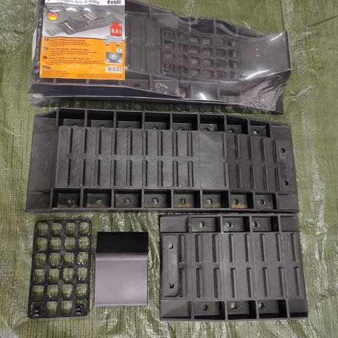 Niveaukilesæt til campingvogn eller autocamper med tilhørende stopklodser. Sættet bruges til nivellering af køretøjet på ujævnt underlag.