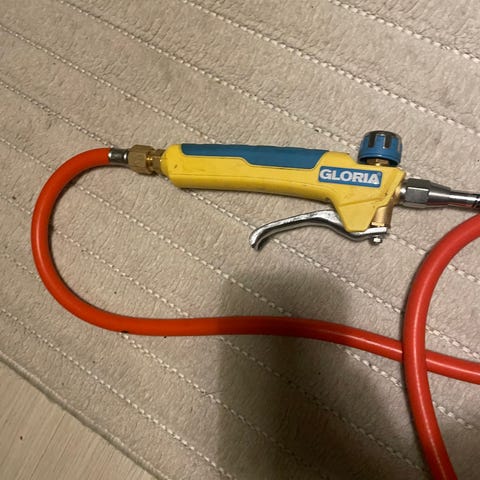 Gasbrænder med lang metalstang, brænderhoved, gasslange og tilhørende regulator. Velegnet til opgaver som ukrudtsbrænding eller opvarmning, hvor der er behov for en håndholdt gasflamme. Brænderen tilsluttes en gasflaske via slangen og regulatoren.