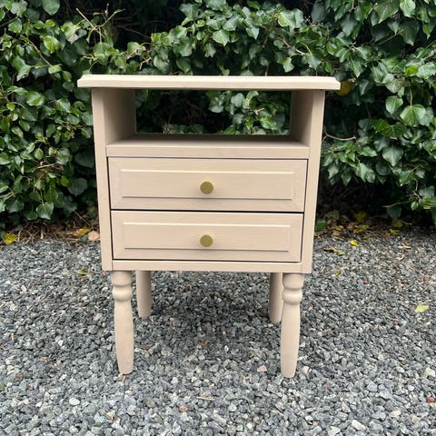 Lille natbord med to skuffer i. Bordet har synlige brugsspor som det ses på billederne. Trænger til en gang maling.