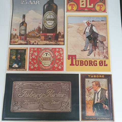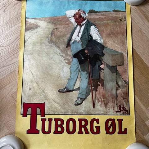 Tuborg plakat med motiv af en ældre mand, der står ved en vej i et landskab. Plakaten viser manden med stok og jakke over armen, lænet op ad en pæl. Nederst på plakaten ses Tuborg-navnet. Velegnet som vægdekoration i hjem, bar eller hobbyrum for dem, der ønsker et klassisk ølmotiv i vintage-stil.