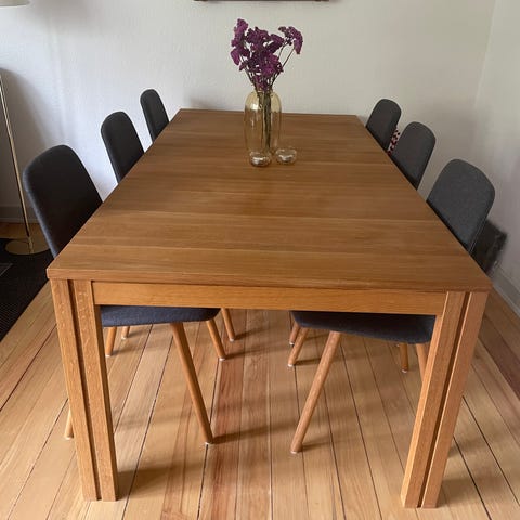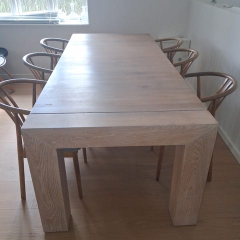Spisebord i lyst egetræ. Bordet har en rektangulær bordplade og kraftige, firkantede ben. Der er 2 tillægsplader til bordet, hver 47 cm. Egnet som spiseplads i køkken eller spisestue, hvor der er behov for et større bord med matchende stole.