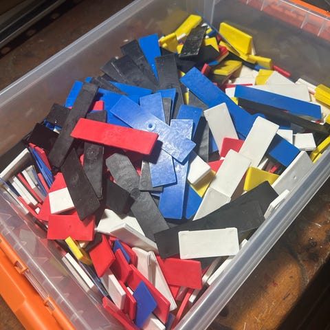 Knudsen Kilen gul plastkiler. Kilerne er fremstillet i plast og leveres i en kasse med i alt 200 stk. Velegnet som afstands- og justeringskiler ved montage- og byggeopgaver, f.eks. til døre, vinduer og andre konstruktioner, hvor der er behov for præcis opklodsning og nivellering.