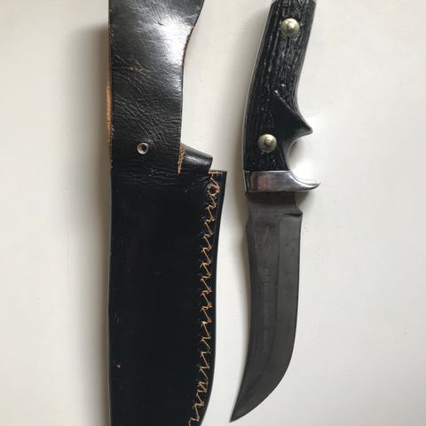 Jagtkniv, HOWLING WOLF, KÆMPE JAGT DOLK MED KRAFTIG LÆDERSKEDE OG BOWIE FORM.