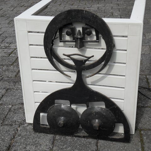 Udendørs skulptur af sten og jern/metal, ved ikke hvem kunstner er.