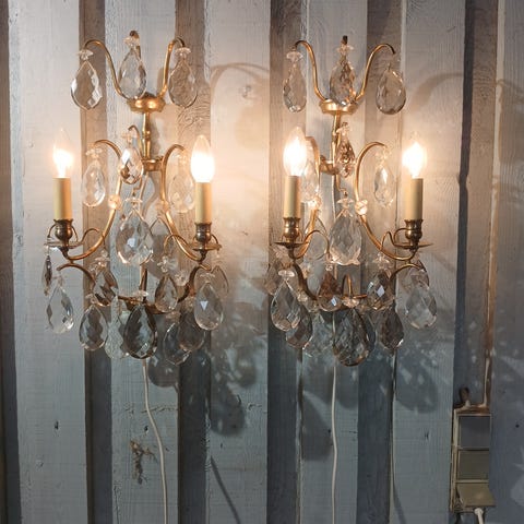 Par af to franske vintage væglamper. Med komplekse kurver, arkantus-blade og rocaille-ornamenter, der er kendetegnende for rokoko-stilen (Louis XV).