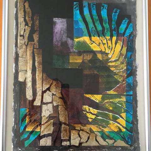 Flot collage af Lene Frederiksen monteret på skifferplade