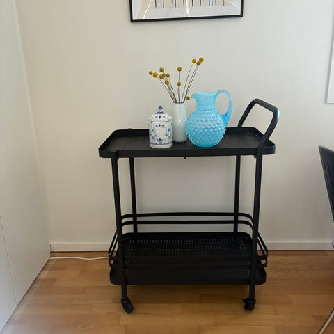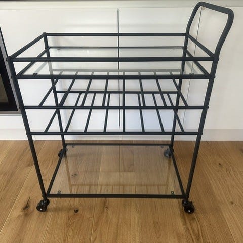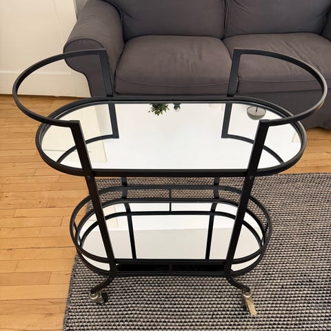Super flot Barvogn i sølv på hjul. Spejlplade i bunden og glasplade for oven. Fejler ingenting.