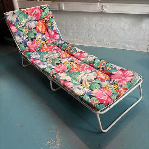 Liggestol og havestol med blomstret retro stof. Sættet består af en sammenklappelig liggestol med metalstel og kraftig madras i flerfarvet blomstermønster samt en havestol med høj ryg, metalstel og armlæn. Havestolen har fastmonteret hynde med brune og orange blomster. Begge møbler er velegnede til brug i have, på terrasse eller altan og kan foldes sammen for nem opbevaring. Garantere ikke holdbarhed, men virkelig smukke.