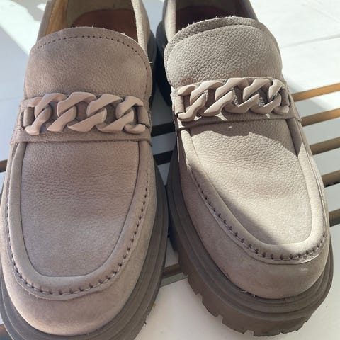I beige/sandfarvet ruskind med sort gummisål. Brugt en enkelt gang.