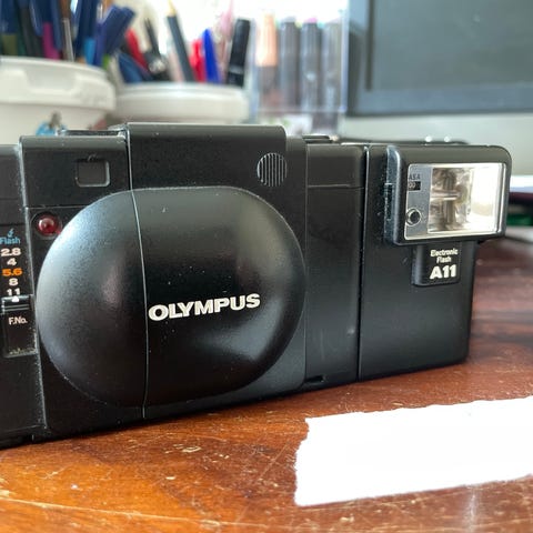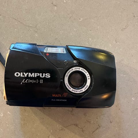 Olympus µ[mju:]-1 kompaktkamera i sort. Analogt 35 mm filmkamera med indbygget blitz og søger. Kamerahuset er kompakt med skydeklap foran objektivet og bagklap til isætning af filmrulle.
