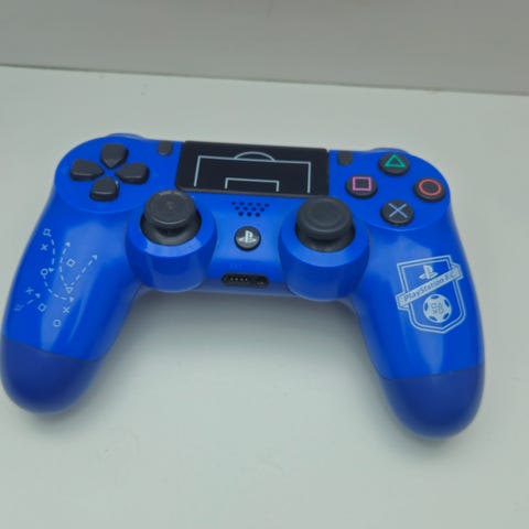 Sony DualShock 4 controller til Playstation 4 i blå farve. Trådløs gamepad med indbygget touchpad, lysbjælke, højttaler og vibrationsfunktion. Egnet til brug med Playstation 4-konsoller og kompatible enheder, der understøtter DualShock 4-controlleren.