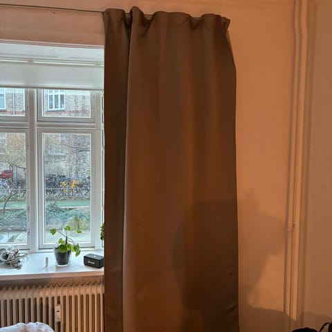 Ellos gardiner i ensfarvet, neutral tone. Gardinerne er lange og hænger fra skinne eller stang med rynkebånd/topbånd, som giver et tæt fald.